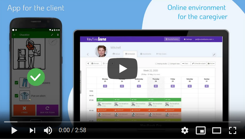 Often a person with special needs can use some extra help getting through the daily tasks. The RoutineFactory app on phone & tablet can help! Provide clear visual weekly schedules, reminders, digital assistants, and help with controlling emotions.